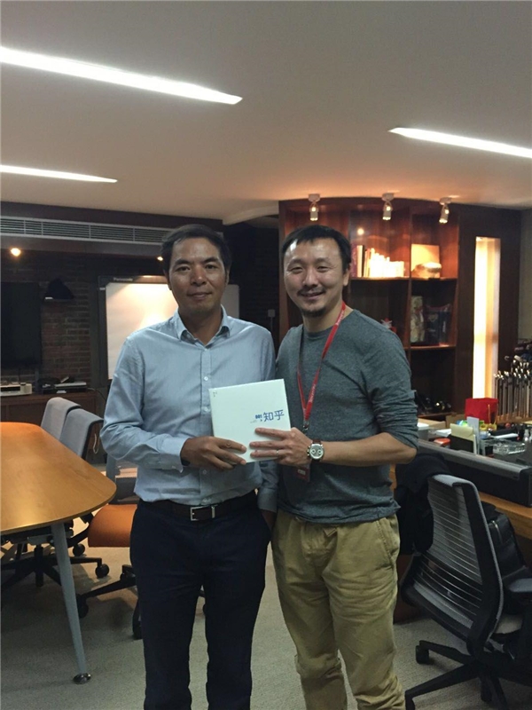 (图注:知乎联合创始人黄继新向张小龙赠送知乎出版的第一本实体书)