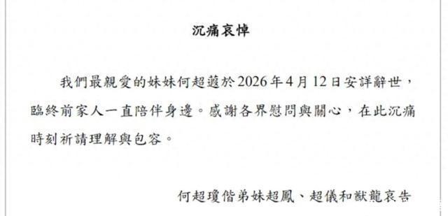 ?????? 4�日,赌王千金何超琼发讣告,自己的妹妹何超蕸因病离世?????? 享年六十岁,何家二房手足齐聚,全程陪伴送她最后一程。?????? 何超蕸是赌王二房蓝琼缨的三女儿,在家族中一向低调,鲜少出现在公众视野,她终身未婚未育,长期受病痛困扰,最终在家人的陪伴下安详离去。?????? 离世后,何超琼第一时间对外发布讣告,姐姐何超凤、何超仪,弟弟何猷龙全程守在她身边,尽显手足间的深厚情谊。?????? 何超蕸的学历背景十分亮眼,她曾在美国知名高校深造,拿下双学士学位,前几年还获颁香港大学名誉院士头衔。?????? 在家族企业信德集团,她是不可或缺的幕后骨干,负责地产与商业运营核心板块,被赌王评价为“最能提供协助的女儿”,母亲蓝琼缨晚年卧病时,她贴身照料,家族有分歧时也从中调和。?????? 她还积极投身公益事业,曾担任东华三院主席,去年大埔火灾后,牵头家族成员捐出千万港元助力灾后重建,还获得过铜紫荆星章、太平绅士等荣誉。?????? 早年的何超蕸长相精致,混血基因让她幼时像个洋娃娃,长发披肩的模样甜美动人,长大后她偏爱短发中性风,弟弟婚礼上她穿西装出席,尽显独特酷感。?????? 何超蕸的低调并非能力欠缺,而是主动选择的人生姿态,在光芒四射的姐妹身旁,她甘愿做衬托的绿叶,把精力放在实处,成为二房稳定发展的重要支柱。?????? 她终身未婚未育,打破了豪门追求多子多孙的传统模式,转而用事业与慈善实现自我价值,这种选择在豪门圈子里显得格外清醒与独特。?????? 没怎么听说过的姐姐,但家人陪伴送终挺温暖的,安息吧是啊,即便一生低调,能被家人温柔以待,这样的结局也足够圆满。?????? 何超蕸的一生,看似平淡却满是分量,她在家族里默默付出,在社会上承担责任,用行动赢得了家人的疼惜和社会的认可,她的离世,让外界看到了豪门成员不为人知的细腻一面,也引发了人们对人生选择的深度思考,这样一位低调的千金,为何能在家族中扮演如此重要的角色,或许我们能从她的人生选择里找到答案。?????? 在我看来,何超蕸才是活得最通透的豪门千金,比起抢风头、争资源,她更愿意守着自己的节奏,做实在的事,不用活在聚光灯下,不用为了家族利益妥协,把时间留给家人和热爱的事业,这样的人生哪怕低调,也足够精彩,她的离去虽让人惋惜,但她留下的踏实与温暖,值得被所有人记住。?????? 这事你怎么看?