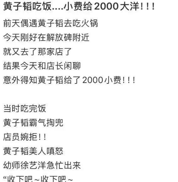 一向在物质上都很大方的黄子韬,这次表现出来的慷慨,同样震惊了所有人。去火锅店用餐,每位服务过他的店员都得到元的小费,就连见多识广的老板也被他的豪爽震惊了。