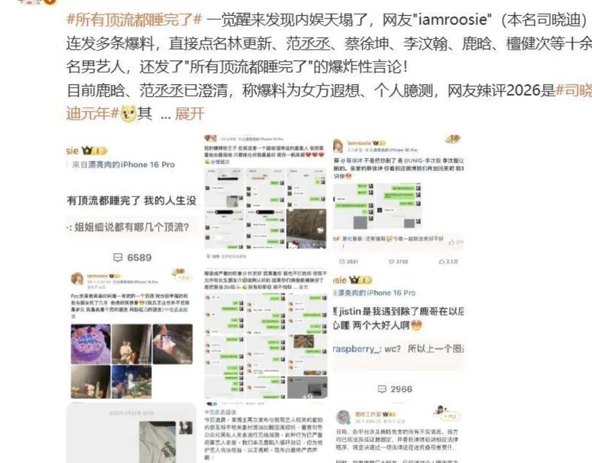 今天一早醒来,手机直接炸了。好多群都在转一个叫司晓迪的网红发的话,说自岁已经睡过内娱一大半顶流男星。名单长得吓人,鹿晗、蔡徐坤、范丞丞、林更新、檀健次全在上面,还晒了合照、聊天记录和转账截图,搞得跟真的一样。一开始我还信了两秒,毕竟图都发了。但她晒的那张和鹿晗“醉酒同床”的照片,没多久就被网友扒出是AI合成的。光影不对,耳洞位置也不对,连衣服都不是鹿晗常穿的款。更离谱的是,她顺嘴提了一嘴“关晓彤和王安宇在一起”,结果这两人工作室也出来澄清了,纯粹是她乱编。