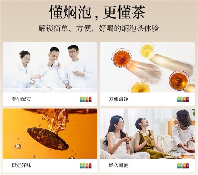 在产品层面,小罐茶焖泡茶通过陈皮白茶、茉莉普洱、黑乌龙茶和桂花六堡四款特色茶品的“多风味”组合,精准承载了现代年轻群体丰富多元的口味需求。这四款茶品瞄准年轻茶客及潜在茶饮新用户的“口感舒适区”,运用多种天然味源调配出从清淡到浓厚、从传统到创新的多样化味觉体验,配合具有吸引力的"国民价格"定位,有效降低了目标人群的尝试门槛,为培养长期饮用习惯创造了条件。