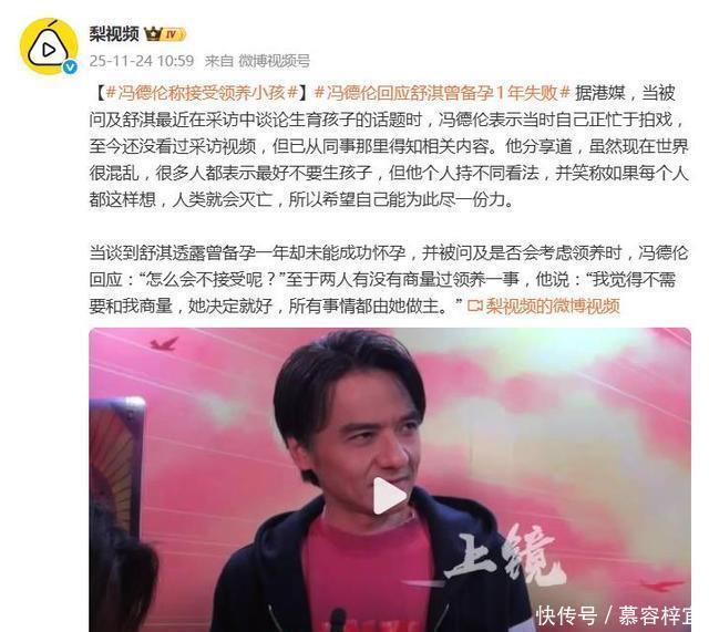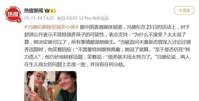 ?????? 据港媒报道,11日冯德伦出席活动时,被记者追问舒淇此前透露的领养意愿。他几乎不假思索就表态:“怎么会不接受呢?”更坦言夫妻间无需特意商量,“她决定就好,所有事情都由她做主”。被追问是否还在尝试自然怀孕时,他幽默转移话题:“领养就不用太努力了”,引得现场笑声一片,也把隐私问题轻巧带过。?????? 这番回应看似随意,实则信息量十足。要知道,舒淇此前在采访中曾透露,为备孕不惜停工一年,却因高龄和严重过敏等健康因素未能如愿,并特别强调自己“非主动丁克”。如今冯德伦不仅全盘接纳太太的想法,更把决定权完全交到她手中,被网友赞为“尊重伴侣的模范级操作”。