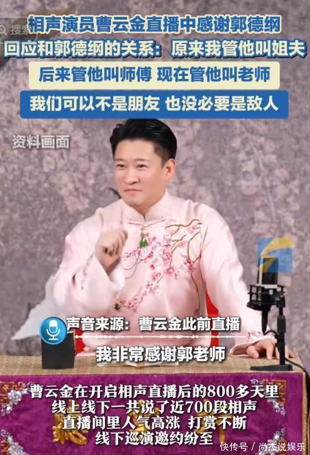 第三个就是对郭德纲的态度。曹云金说,当年离场后他坐在车里哭了很久,舍不得大家一起在苦日子里磨炼出的情谊。近些年他也多次当众表达对郭德纲的感谢,今年 8 月份直播时就说过:“我非常感谢郭老师和德云社对我的培养。”