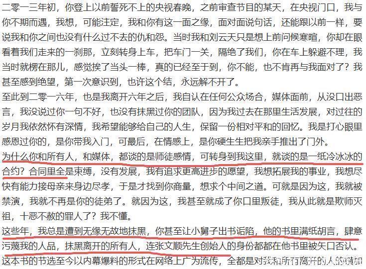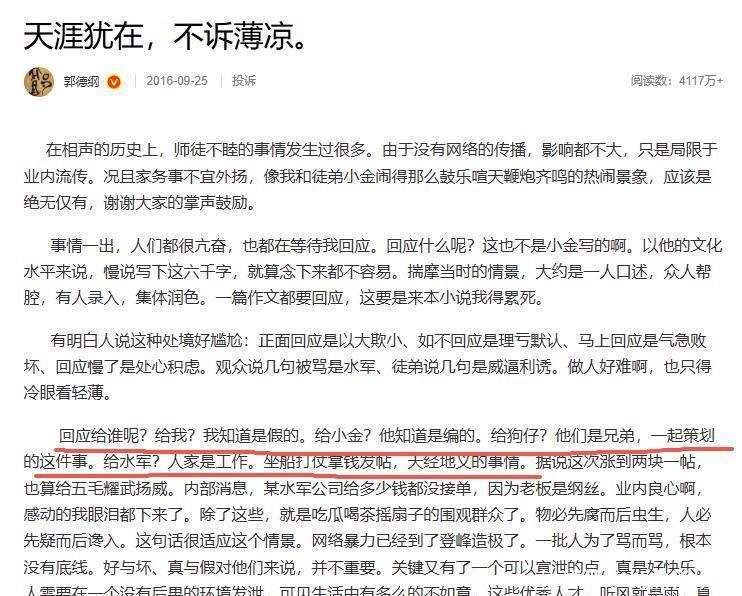 诸如此类被剥削的事,曹云金洋洋洒洒写了一长段,字里行间的苦,读者看了都心生同情。而郭德纲那边迅速澄清,针对曹云金的控诉,条条有回应,暗讽他小肚鸡肠。