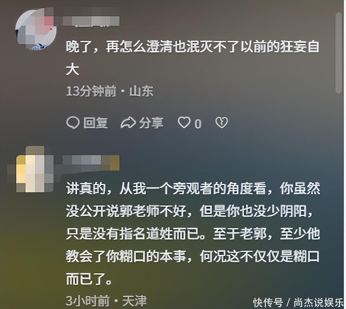 大家很快翻出年那条 6000 字控诉长文,还有当年各种吐槽、指责郭德纲的微博。这些 “黑料” 至今还明晃晃挂在网上,和他现在的 “感恩” 态度形成鲜明对比。从前憋着一股劲要“推翻”师傅,他现在突然服软、示好,很多网友并不买账,还嘲讽说:要不要先把微博删一删?