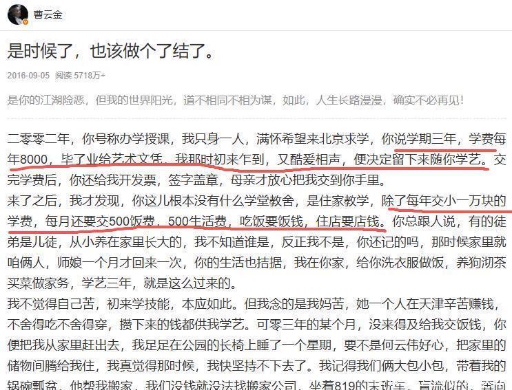 郭德纲说,教徒弟时关门是常态,曹云金说的学费纯属子虚乌有。所谓的住宿费也是曹云金主动提出的,所有收费都按圈内规矩来,自己没多要一分钱。反而在他落难时,曹云金第一时间撇清关系,实在让人寒心,这才决定将他 “清门”。