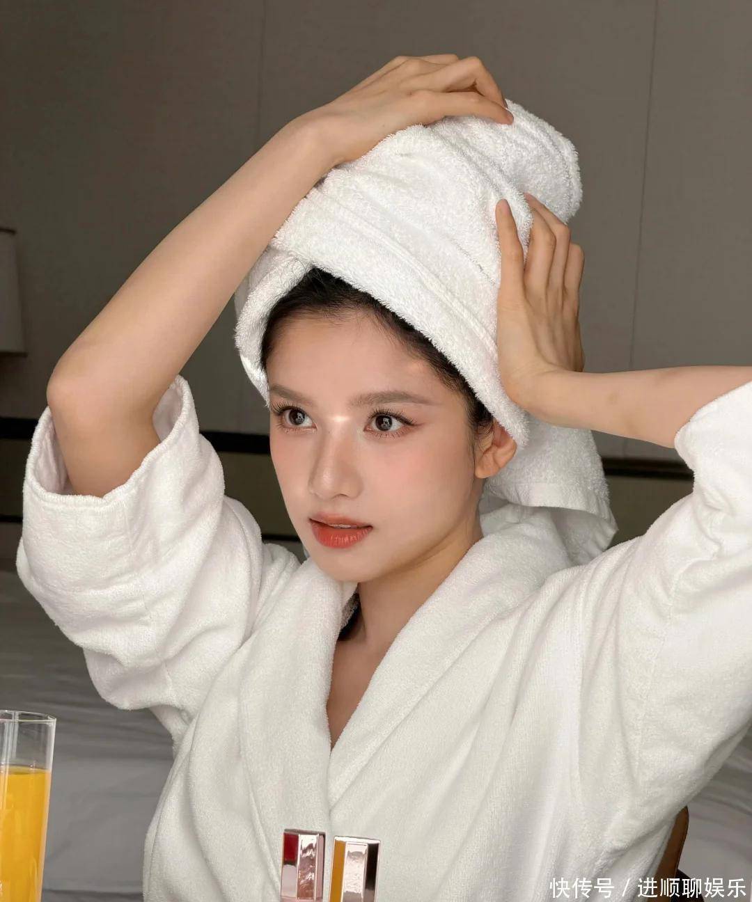 一开始看到的时候我直接愣住了,还想着这姐们儿怎么穿着浴袍就出镜了?照片里她头发随意挽着,浴袍带子松松垮垮系着,手里拿着杯橙汁,站在酒店走廊里笑得那叫一个灿烂,小虎牙都露出来了,脸上连个像样的妆都没有,就涂了点淡淡的口红。