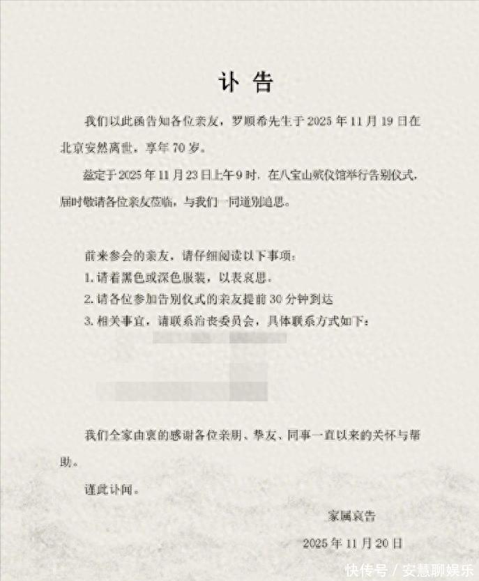 此刻的罗晋在默默处理丧事的同时,也经历着失去至亲的悲痛,挽联中“坦然面对人生”这几个字,恰是罗顺希先生为人处世的写照,这样的长辈,更期望看到的是子女能够勇敢地继续前行,认真对待自己的事业与家庭。艺人的私人生活本不应成为公众讨论的焦点,但在这个特殊的时刻,我们依然能看到亲情中最朴素而真诚的一面,生命终有尽头,而生者仍要继续前行,期待时间能够慢慢抚平这份悲伤。