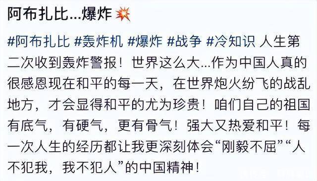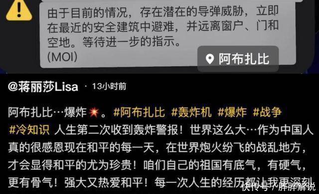不同于李茂的焦虑,蒋丽莎在社交账号上,晒出了一张阿布扎比的轰炸警报截图,还配文讲述了自己的经历。