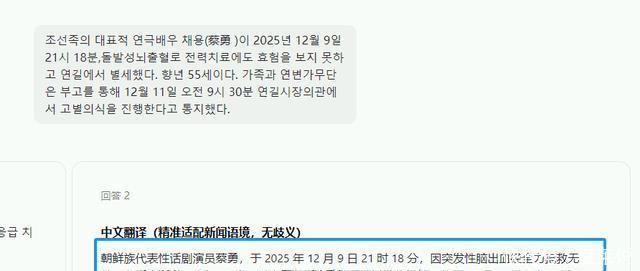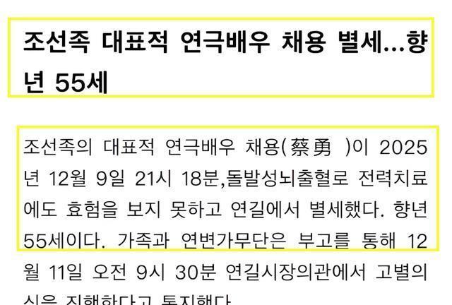 ?????? 由于相关的讣告是朝鲜语,所以不同网站翻译的内容有所区别,但结合多数的结果来分析,蔡勇去世应该是突发性脑溢血导致。