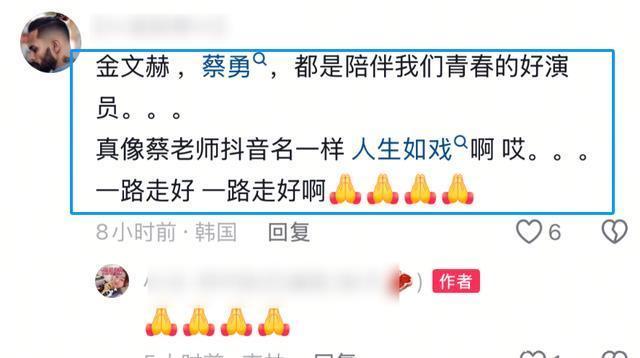?????? 可能很多外省的网友不知道,蔡勇在当地的知名度非常高,以至于很多粉丝在悼念的时候,特地说了这样一段感人肺腑的话语:金文赫、蔡勇,都是陪伴我们青春的好演员,真像蔡老师名一样,人生如戏啊,一路走好、前两天直播还看见他了,这么突然……
